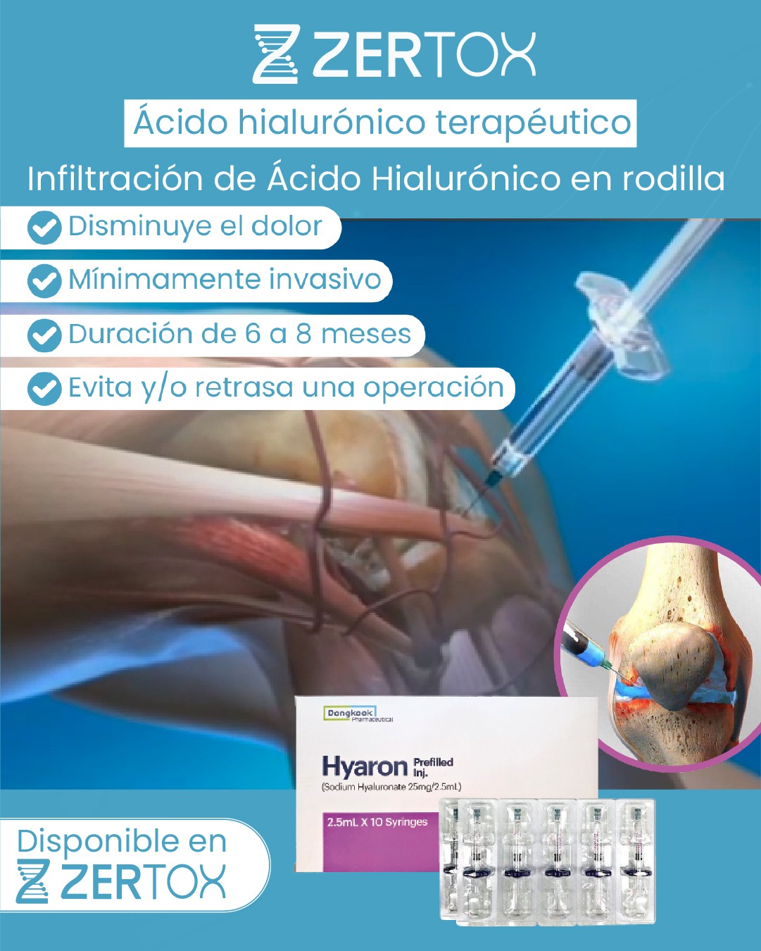 El ácido hialurónico distribuido por Zertox, un producto de alta calidad que ha demostrado su eficacia en el tratamiento del dolor articular. Al elegir el ácido hialurónico distribuido por Zertox, el paciente se beneficiará de: